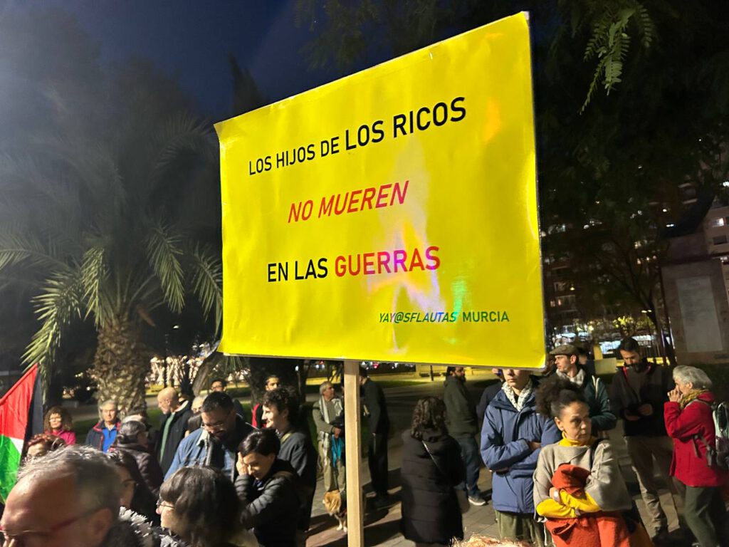 La guerra de Estados Unidos e Israel contra Irán no ha quedado sin respuesta en la Región de Murcia. Un centenar de personas se echó anoche a la calle para denunciar esta agresión unilateral encabezada por un presidente, Donald Trump, que llegó al poder irónicamente con la promesa de acabar con todas las guerras. Entre las pancartas que portaban los manifestantes se podía ver el clásico “No a la guerra” en letras rojas sobre fondo negro, que se hizo célebre en las protestas contra la guerra de Irak en 2003. Los Yayoflautas de Murcia, por su parte, denunciaban que “los hijos de los ricos no mueren en las guerras”. En la pancarta principal, en la que se dejaban ver dirigentes de Podemos, del Partido Comunista y de Izquierda Unida, se exigía además la salida de la OTAN.